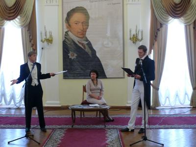 Вечер продолжил «Разговор о счастии». Диалог Н.М. Карамзина с современником прозвучал в исполнении ведущих актёров Ульяновского театра юного зрителя - NEBOLSHOYТЕАТР Николая Авдеева и Александра Сухомлинова.